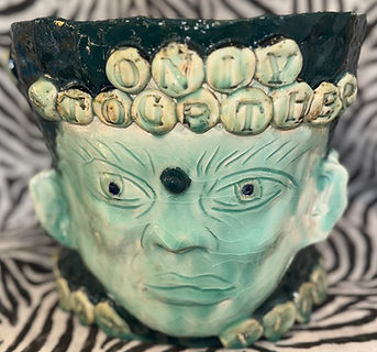 Mold-made bowls combined with hand-built faces stamped with my original mold designs are stacked as totems.
